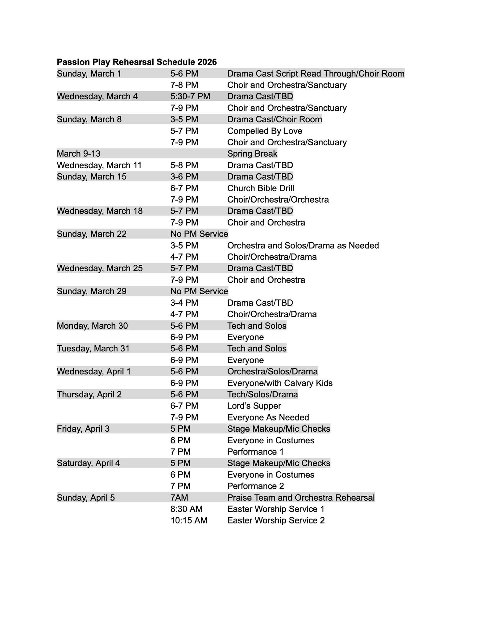 No Evening Service or Activities due to Spring Break